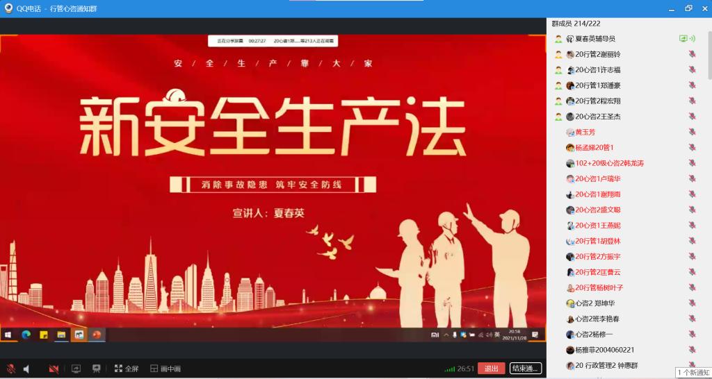 11月28日晚,为了更好的学习解读新《安全生产法》,让同学们增强对安全生产的了解。我校人文社科系2020级辅导员夏春英和陈少霞老师分别通过线上线下会议与同学们一同学习解读新《安全生产法》。