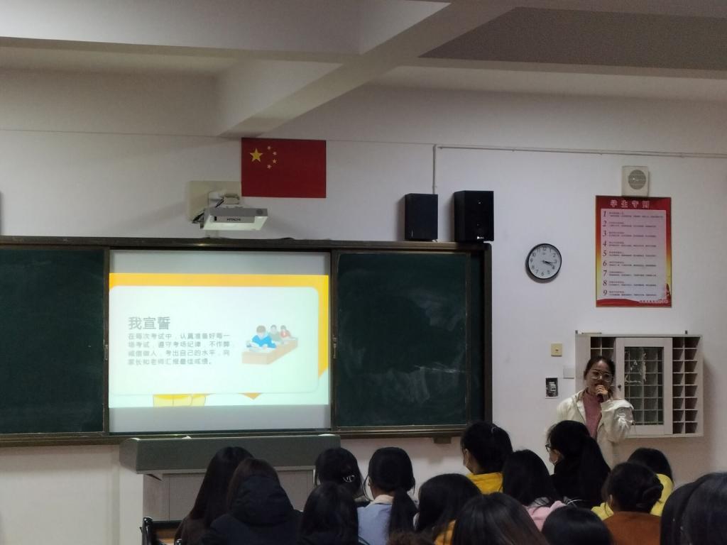 首先,两位辅导员老师对全体学生进行了诚信教育,强调了诚信对于同学们的重要性;其次,对同学宣传诚信应考理念,强化了同学们正确对待考试的态度;最后,辅导员周海英老师带领全体学生进行诚信宣誓。