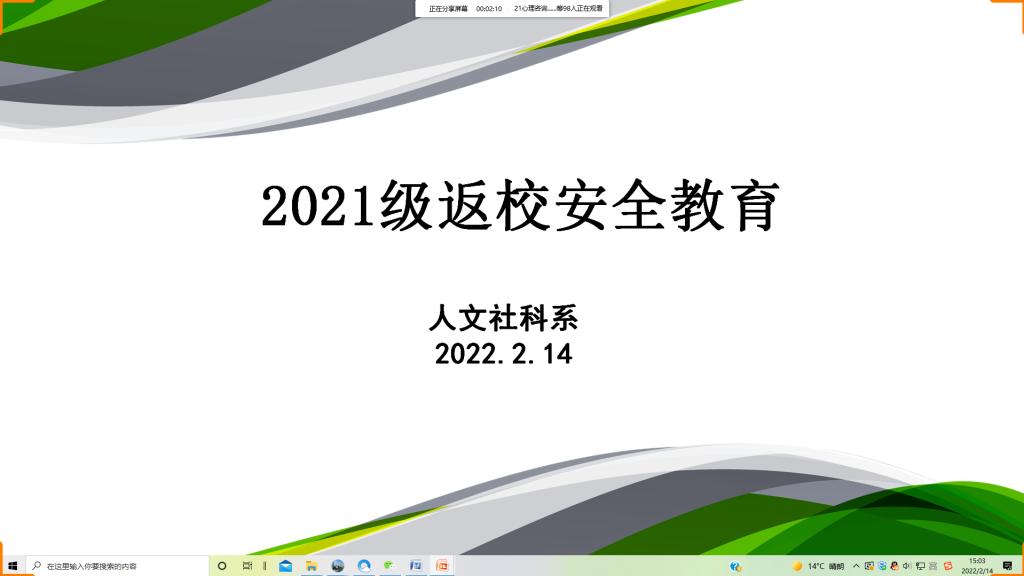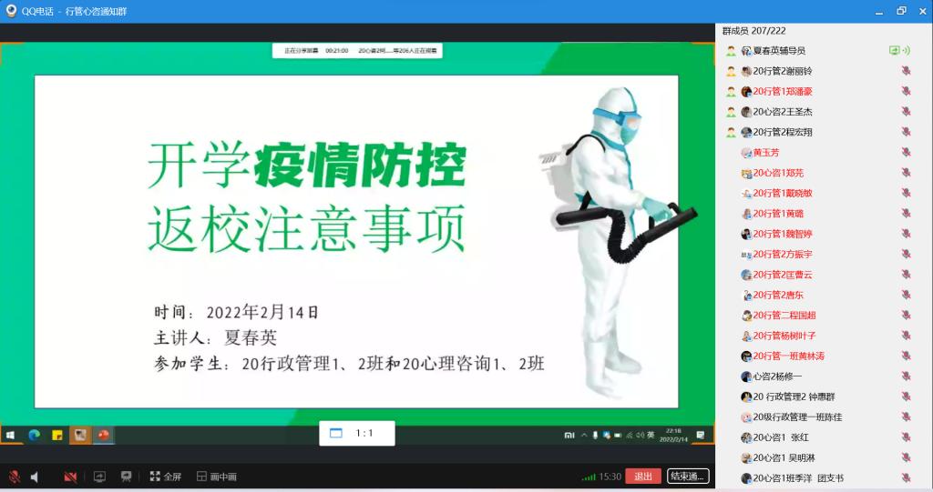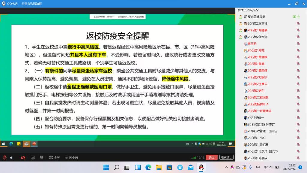 2月14日,为切实做好校园疫情防控,做好新学期学生返校安全工作,确保学生返校工作安全有序推进。我校人文与管理学院各年级辅导员陆续在线上进行“返校安全”主题会议。
