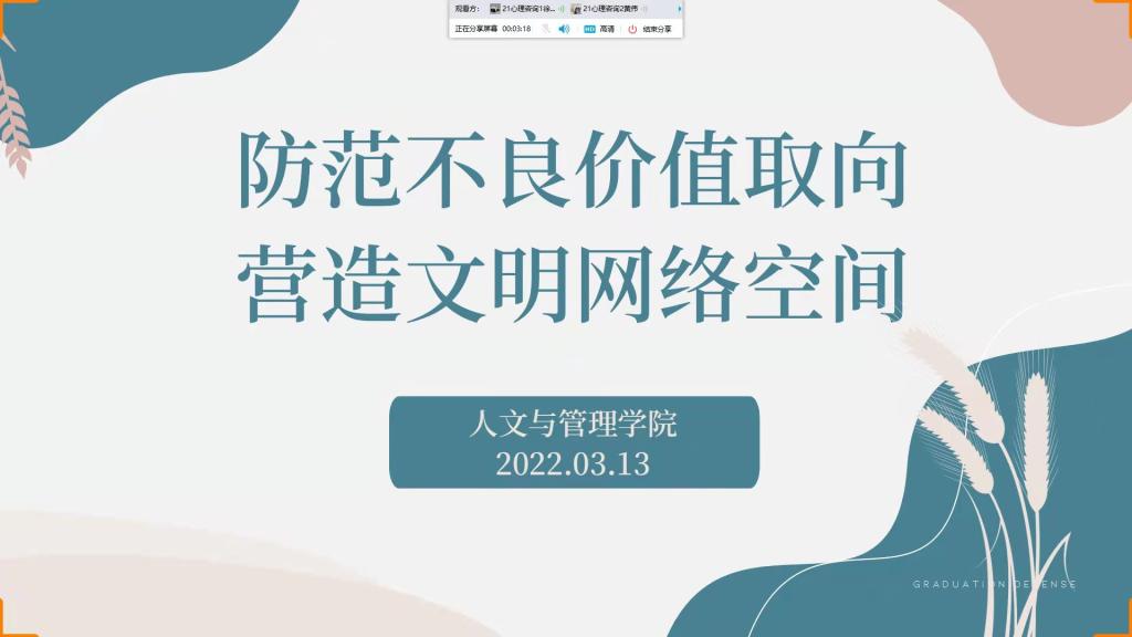 为深入学习贯彻树立正确的世界观、人生观、价值观,加强青少年思想道德建设律,进一步培养学生的优秀品质,促进青少年网络道德教育全面发展,符合社会主义事业的思想道德修养新要求。3月13日,人文与管理学院21级于仓山校区以及福清校区线上共同开展了“防范不良价值取向,营造文明网络空间”的专题学习,此次活动由仓山校区辅导员叶懿蛟老师和福清校区辅导员周海英老师主讲。