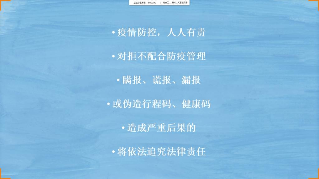 会上,两位老师通过问答和反思的方式,讲解核酸检测高频率的必要性,提出病毒不可控性需要短期内动态反复检测,特别对核酸检测漏叫和谎报的严肃性问题进行强调,应做到“应检尽检,全员检测”。其次,强调全体学生不得违反学校的规章制度,特别是在疫情期间拒绝外卖,尽量不网购以减少快递流动。同时,要认真做好宿舍卫生,做到基本防疫措施,提高自我防护意识和能力。最后,两位老师倡议同学们在疫情期间,要自我调节心态,以健康合理积极乐观的心态应对疫情防控工作,并将疫情防控意识落实到生活实际中。
