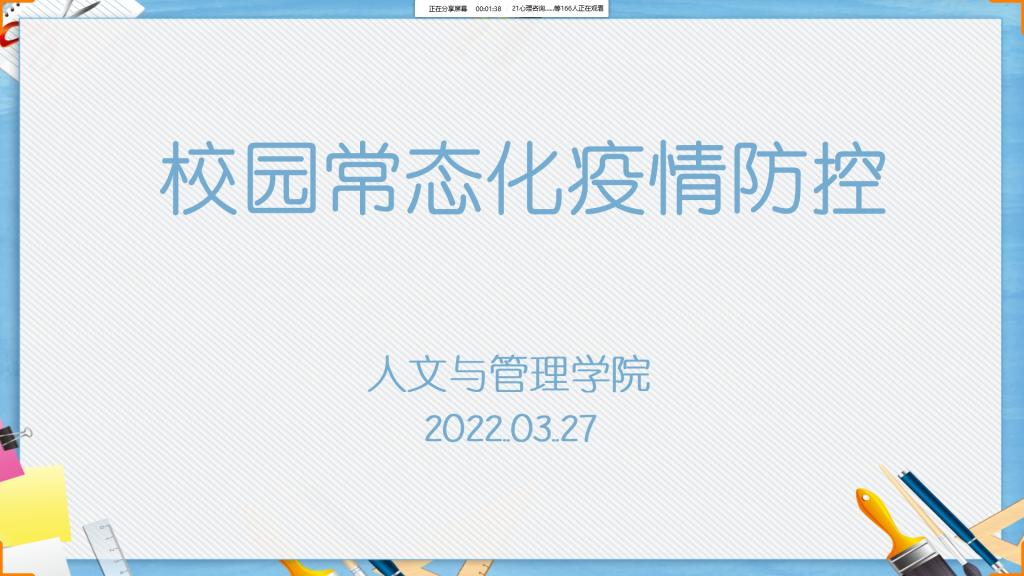 为加强新型冠状病毒肺炎疫情防控工作,进一步进行心理疏导和健康教育,切实保障学生的生命安全和身心健康。3月27日,仓山校区以及福清校区人文与管理学院21级全体学生在线上共同开展了疫情防控主题教育活动。此次活动由仓山校区辅导员叶懿蛟老师和福清校区辅导员周海英老师主讲。