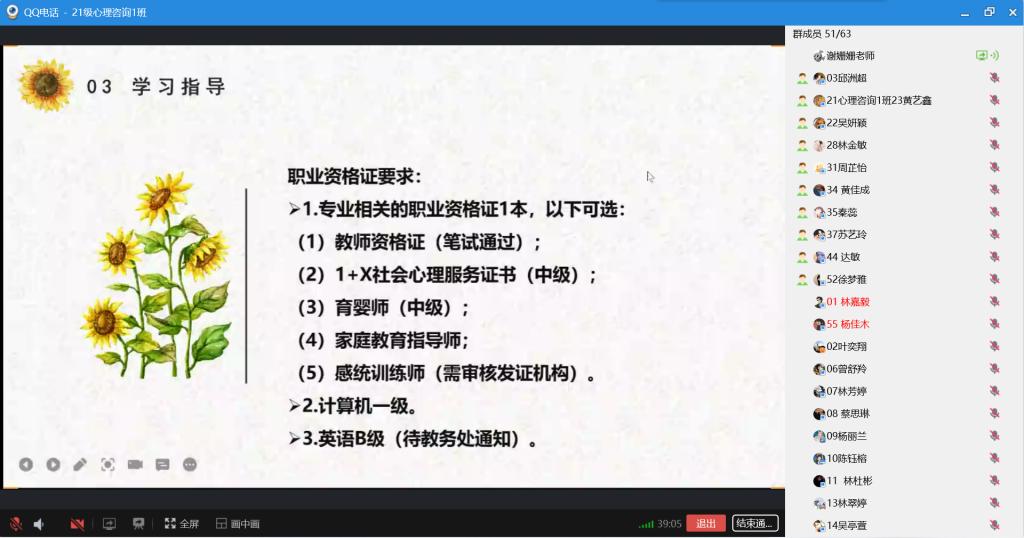 紧接着,同学们在线上观看《认识人生》的视频,通过对人生难题的思考,感悟人生,珍惜当下。谢老师还对同学们的学习和生活进行指导,主要有以下几点:规律作息、少刷手机、净化学习环境、合理安排学习等。班会最后,谢老师再次强调要调整身心状态,制定合理学习目标,学起来。