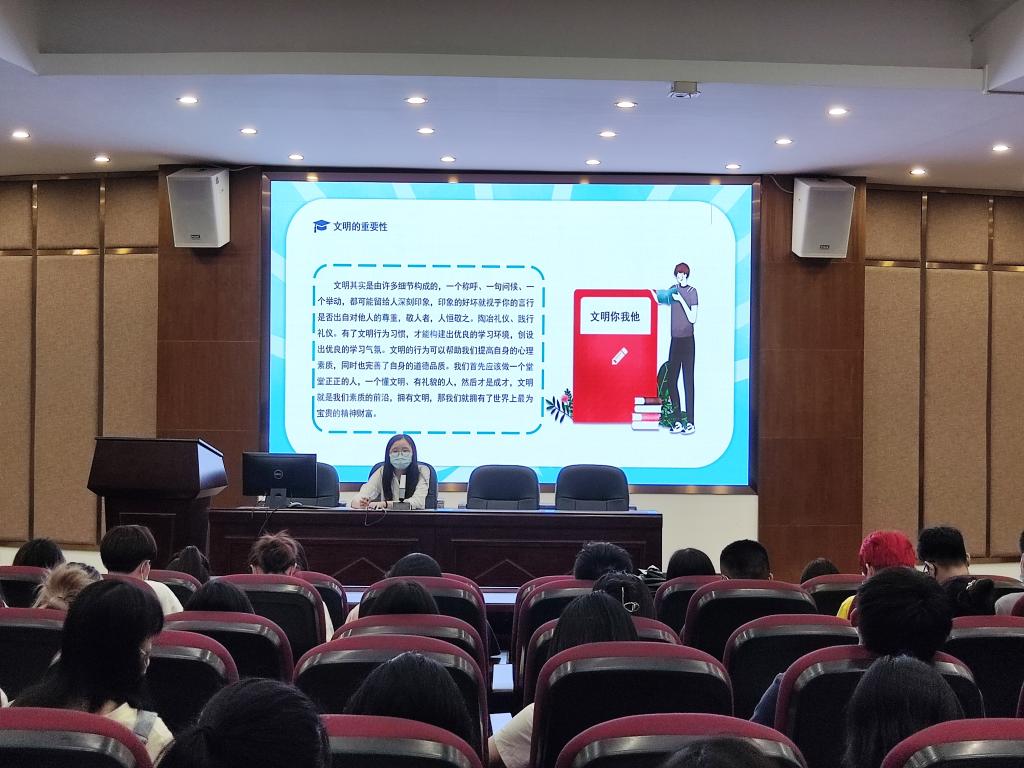 为更好地进行文明教育,让诚信文明深入人心,让文明风采伴随你我他。我校人文与管理学院辅导员夏春英和陈少霞老师分别在仓山校区图书馆二楼学术报告厅与教学楼3-504开展“文明风采伴我行,成就出彩人生梦”主题教育。