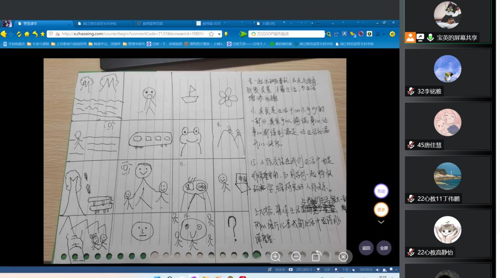 在“开启心理防疫之旅”互动环节中,张宝英老师以“制作我的特色牌卡”、“秀出班行”班级暖心故事分享、“‘疫’路前行”治愈我们的九宫格等线上活动展开。在“制作我的特色牌卡”中,同学们积极探索内心世界,在创作中培养觉察、接纳、调节情绪的意识和能力。在“秀出班行”活动过程中,同学们各抒己见,纷纷讲述了足不出校的日子里,发生在班级里的暖心故事,并向身边的同学表示感谢。在“‘疫’路前行”治愈我们的九宫格活动中,同学们分享防控期间对自己很有意义的九张照片,老师结合班级同学的心理增能的方法,讲解了“防疫心理小贴士”,鼓励大家在当前疫情背景下以良好的精神面貌投入学习和生活中,努力充实自己。