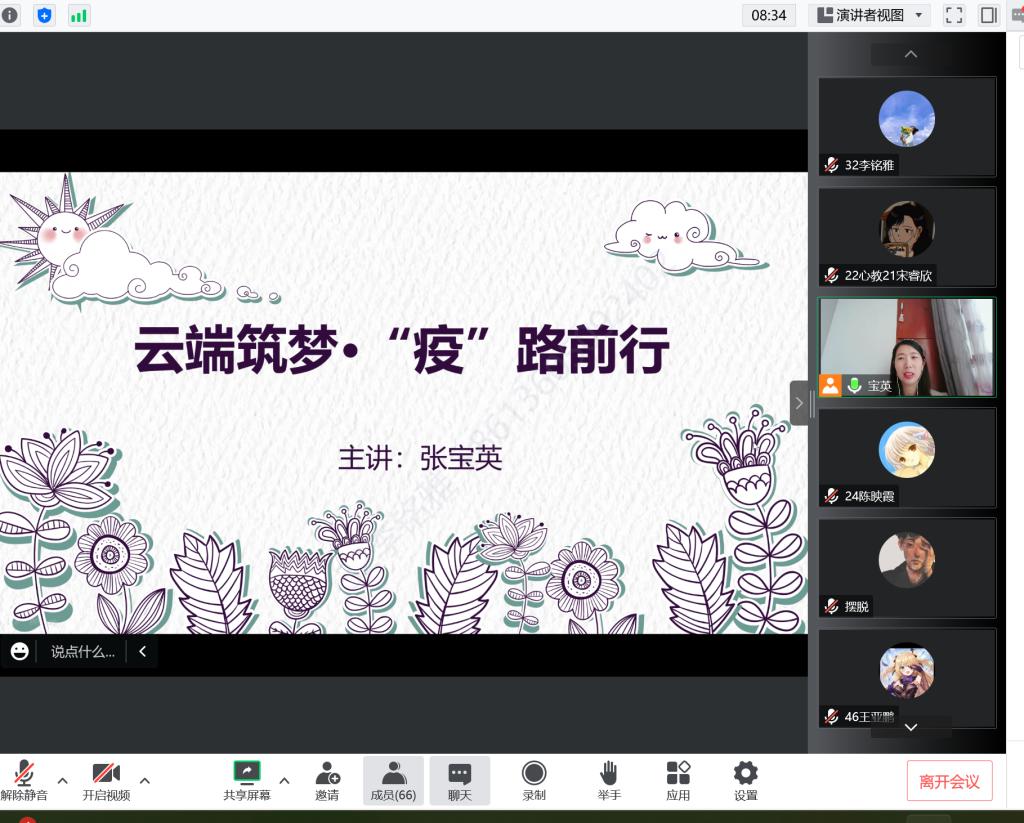 为扎实推进疫情防控特殊时期的大学生心理健康教育工作,帮助学生更好地适应学习和生活模式,增强集体凝聚力和向心力,培育理性平和的健康心态,提升学生对生命价值和自身重要意义的认知,更好地应对挫折和压力。2022年11月7日,2022级心理健康教育专业通过线上的形式开展“云端筑梦·‘疫’路前行”主题班会,本次活动由班主任张宝英老师主持。
