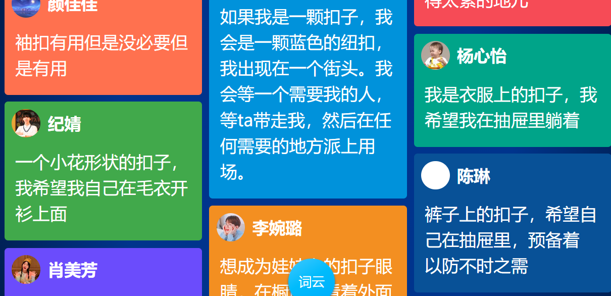 在“假如我是一颗出厂的扣子”活动中,大家想象了自己想要的“出厂设置”,描述了自己想要出现的地方,并在这样的活动中,大家也通过投射看清了自己的个性特点、自己追求的个人价值以及自己在意的人们,选择和决定为自己在意的人们、为自己的个人价值而努力找到人生目标。在故事结局前,大家代入“扣子老三”的角色,进行了“去、留投票”,并在分享中思考了自己的理由,也澄清了个人价值观与决策依据。