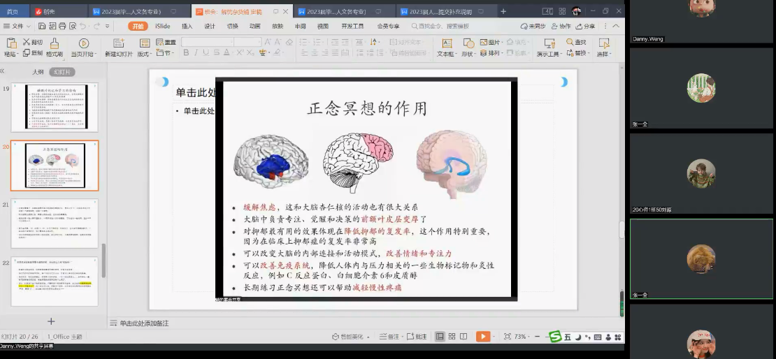 静心感悟,与真实的生活进行链接。张一全老师首先以正念冥想体验为切入点,邀请各位同学放松身心,更真实地感受当下内在和外在世界,然后鼓励各位同学可以在日常琐碎的事情中寻找到积极建设性的意义,放下焦虑,慢慢来,比较快。