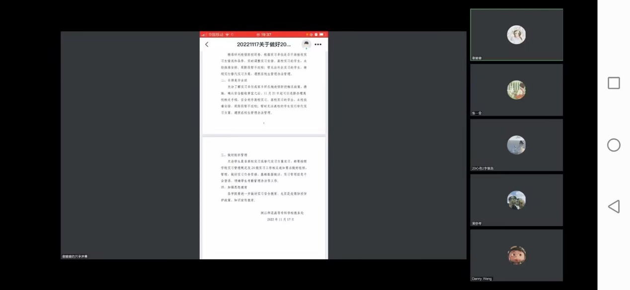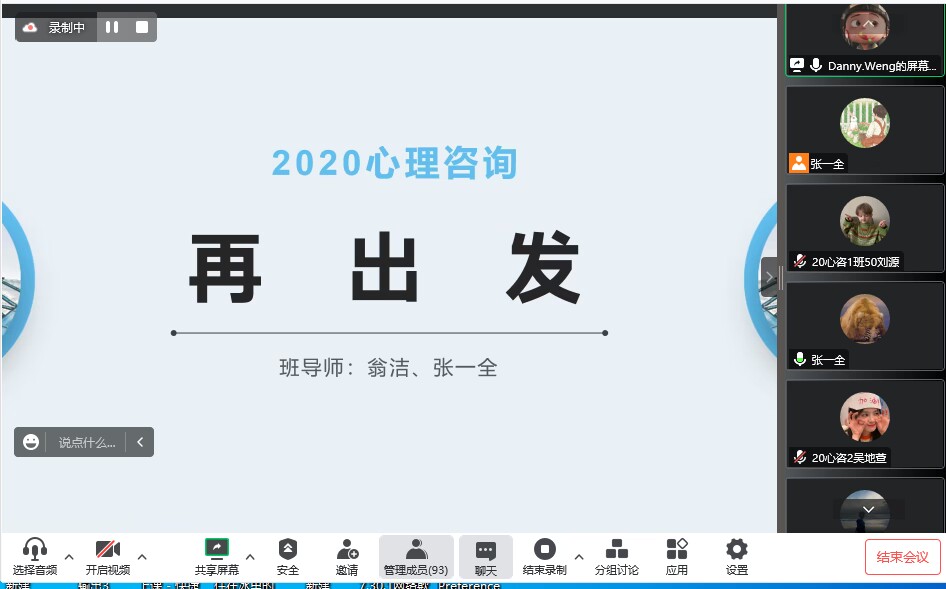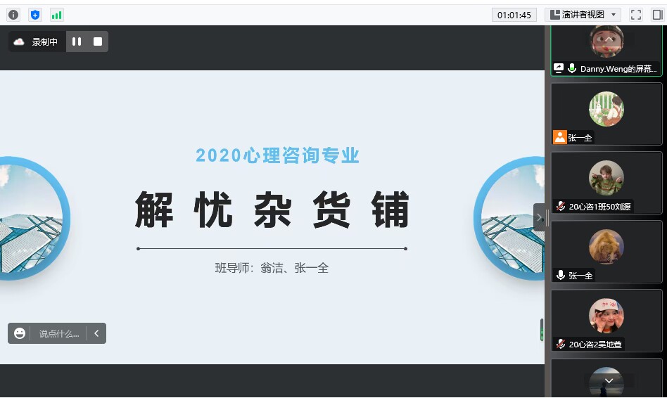 为了更贴近学生的实际需求,引导其脚踏实地规划好各项事宜,2022年11月17日晚20:00,2020级心理咨询1班、2班再次召开毕业班线上主题联欢班会。人文与管理学院心理教研室主任通过文件解读,和毕业班同学说明实习情况,鼓励各位同学遵守防疫政策,积极开展实习材料相关准备,1班班主任翁洁老师和2班班主任张一全老师也进行了相关问题的答疑解惑。随后两位班导师通过投射技术与正念冥想技术的灵活运用,将“解忧杂货铺”的议题贯穿于主题班会之中,分别设计了“超人大作战”和“心灵加油站”的表达性艺术治疗团体辅导主题活动,共同带领大家立足当下,规律生活,找准自己奋斗的节奏。
