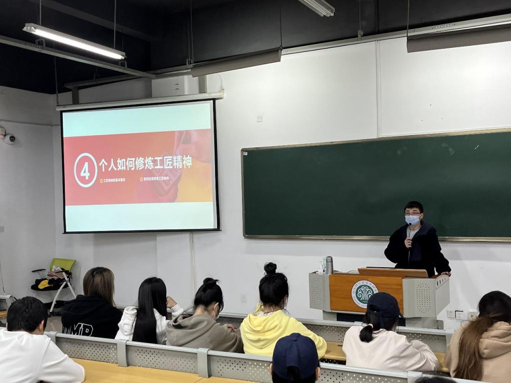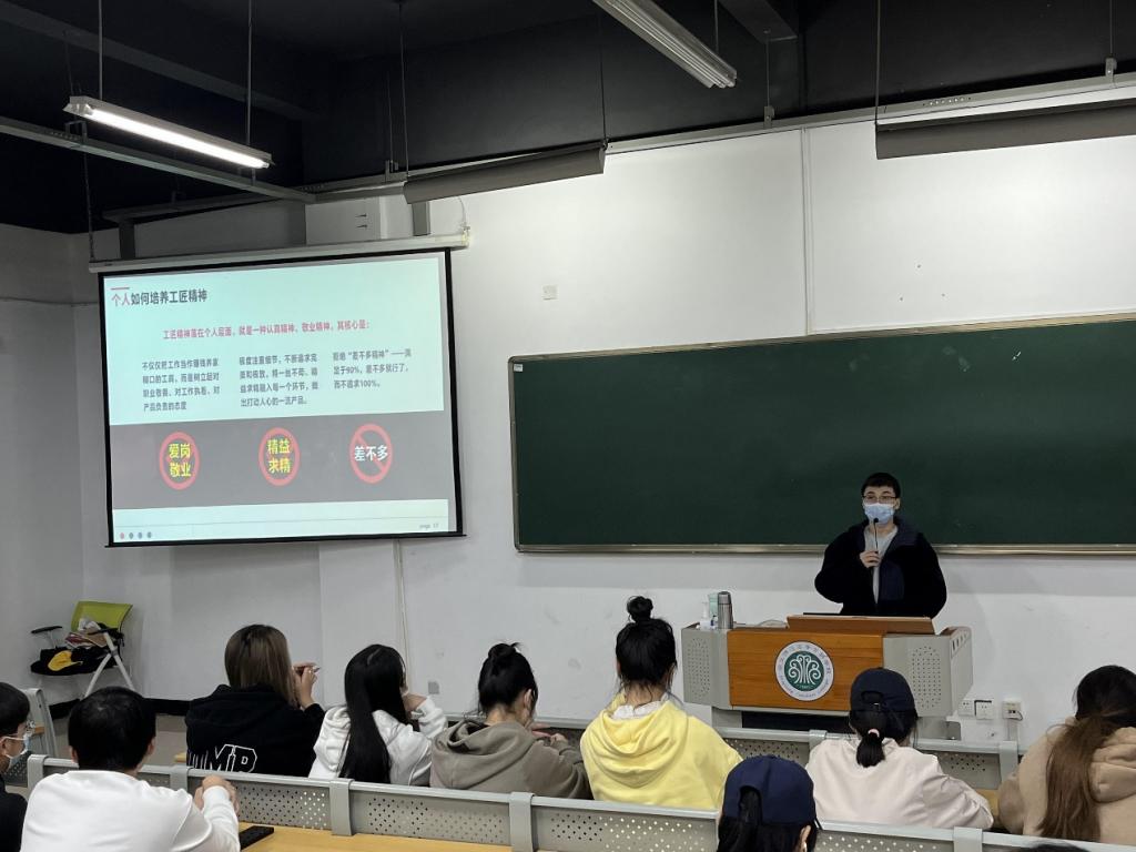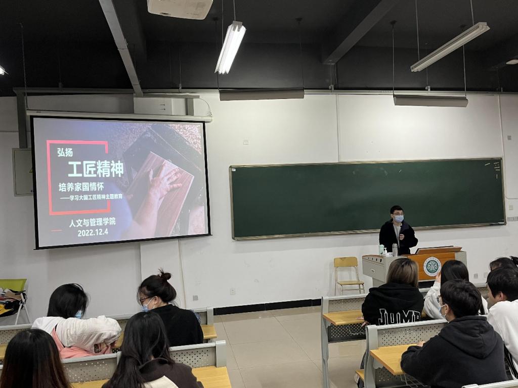 为培育学生精益求精、爱岗敬业的工匠精神,加强学生职业道德素质教育,12月4日,人文与管理学院开展“弘扬工匠精神,培养家国情怀”主题教育,此次活动由叶懿蛟老师主讲,全体2021级学生参加。