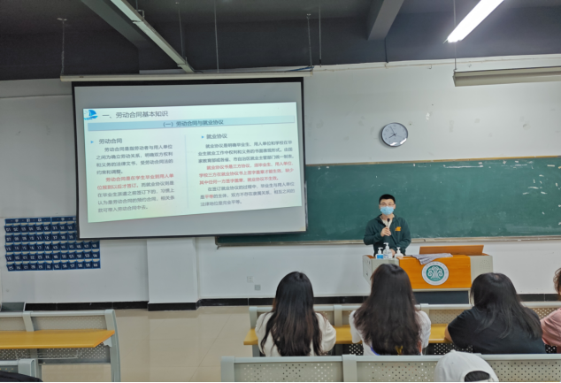 在本次主题教育中,辅导员详细解说了劳动合同与就业协议的相关知识,特别是就业中可能遇到的法律风险和风险规避做了详细的讲解,为毕业生合法签约,保护自身合法权益提供法律保障。通过介绍劳动合同拓宽同学们的知识面,加深同学们对劳动合同的认识,增强劳动合同在毕业生心目中的重要性。最后,辅导员介绍了毕业生求职创业补贴,使得毕业生们更加了解政策,及创业补贴的针对人群、申领条件以及需要哪些申请材料,同时也积极推动毕业生就业和社会保障工作进展。