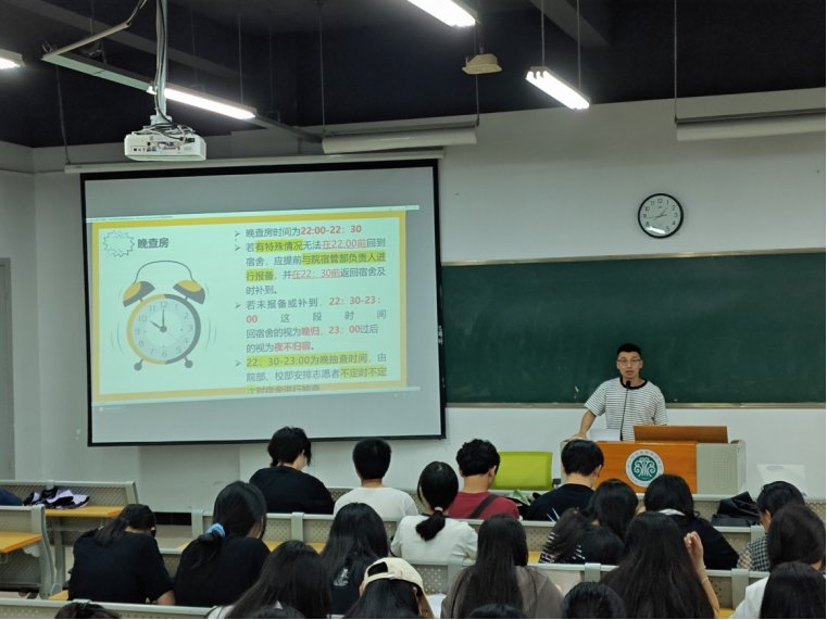 叶懿蛟老师从我校的学生管理规定、违纪处分管理办法、班级文明等方面进行了详细解读,重点强调了宿舍文明安全。他结合过往学生违规违纪案例向同学们阐述了大功率电器、不健康生活方式产生的风险与危害,提醒同学们要提高守规守法的自觉性。