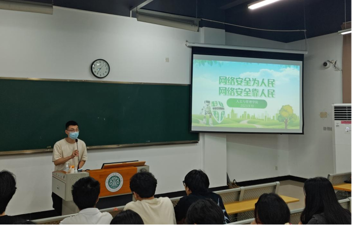为进一步加强网络安全工作,提升网络安全意识和安全防护技能,增强学生保护隐私信息以及辨别相关信息真假的能力,9月10日,人文与管理学院21级于仓山校区2号楼605教室、学术报告厅同步开展“网络安全为人民,网络安全靠人民”主题教育活动,此次活动由21级辅导员叶懿蛟、周海英共同主持。