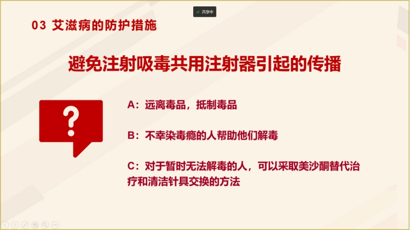 会议上,辅导员老师从认识艾滋病、艾滋病的危害等方面向同学们普及艾滋病知识。其次,老师向同学们重点介绍了艾滋病的传播途径,以及大学生群体艾滋病防治情况,减少同学们对艾滋病患者的歧视,强调了避免发生高危行为对于预防艾滋病的重要性。活动最后,老师呼吁同学们应该正确看待艾滋病患者,并且正确看待艾滋病,倡导同学们自觉养成文明、健康的生活方式,共同建立起预防控制艾滋病的决心。