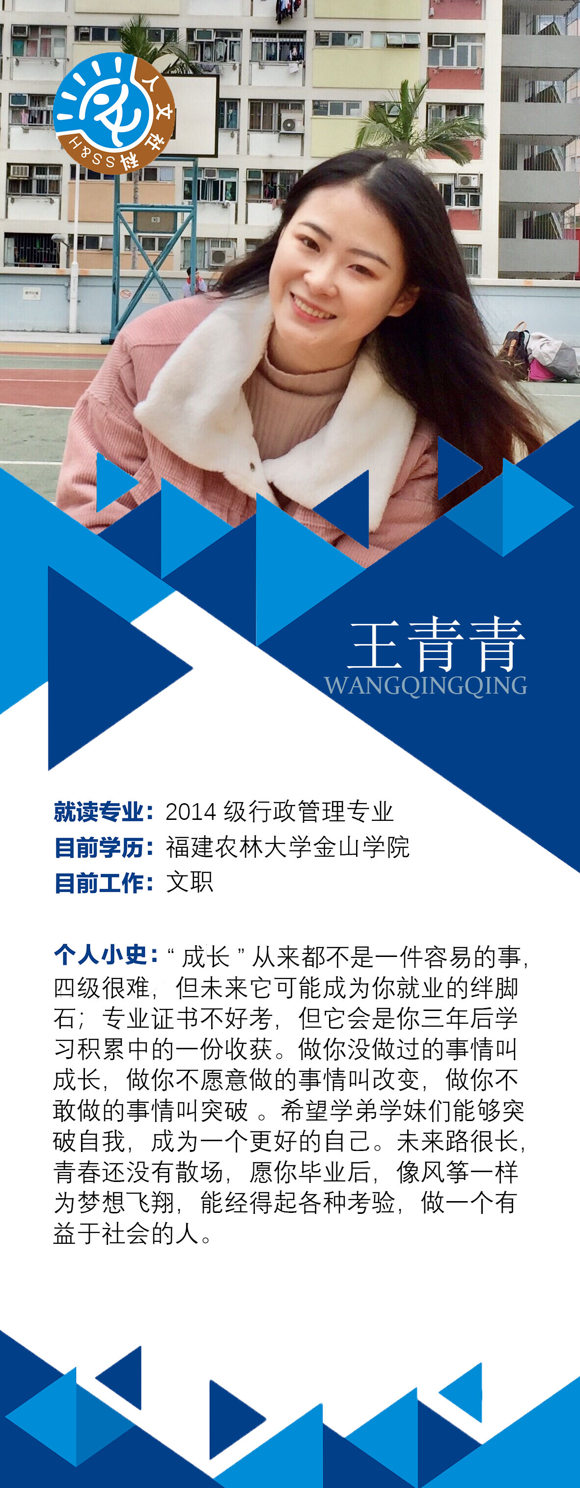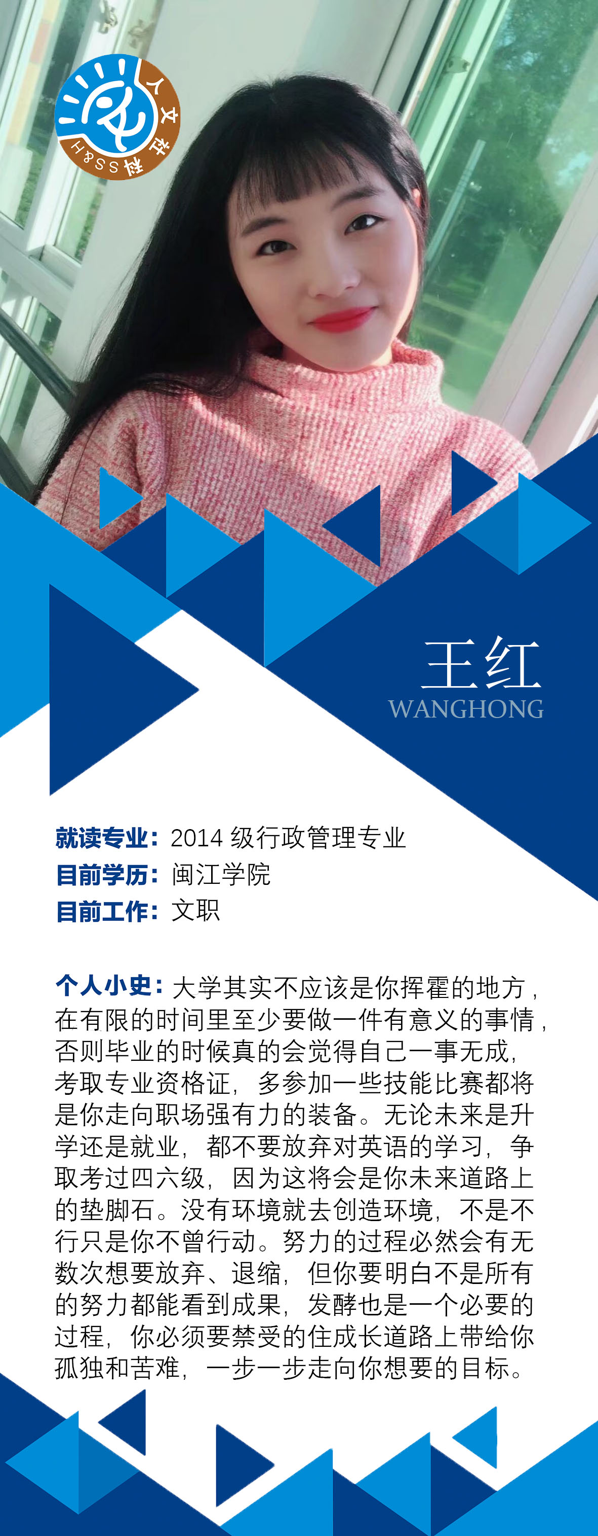 王红 2014级行政管理 当前学历:闽江学院本科 目前工作:加拿大硕士研究生在读
