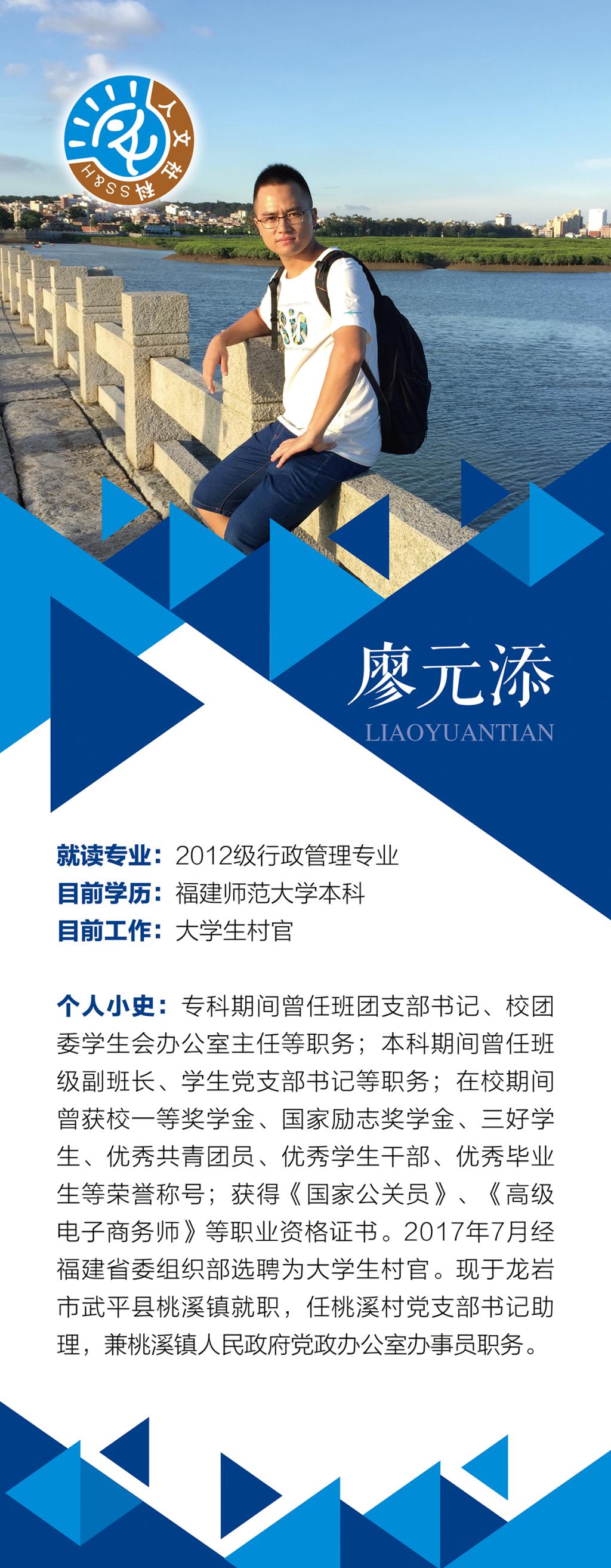 廖元添 2012级行政管理 当前学历:福建师大本科 目前工作:公务员