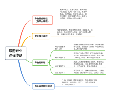 导游专业课程体系以“理论-实践-拓展”为主线,构建模块化培养框架。基础课程融合教育学、心理学、管理学及旅游学科理论,夯实职业通识素养;核心课程聚焦导游基础知识、法规实务、导游业务、英语沟通与创新设计,强化导游业务链条;拓展课程分设综合提升、研学旅行、创新管理和美艺素养四大方向,推动传统与新兴领域能力融合;实践环节通过“实训-顶岗”阶梯式训练,衔接岗位需求。课程体系贯通文化传承与数字创新,培养兼具专业深度与跨界适应力的复合型人才