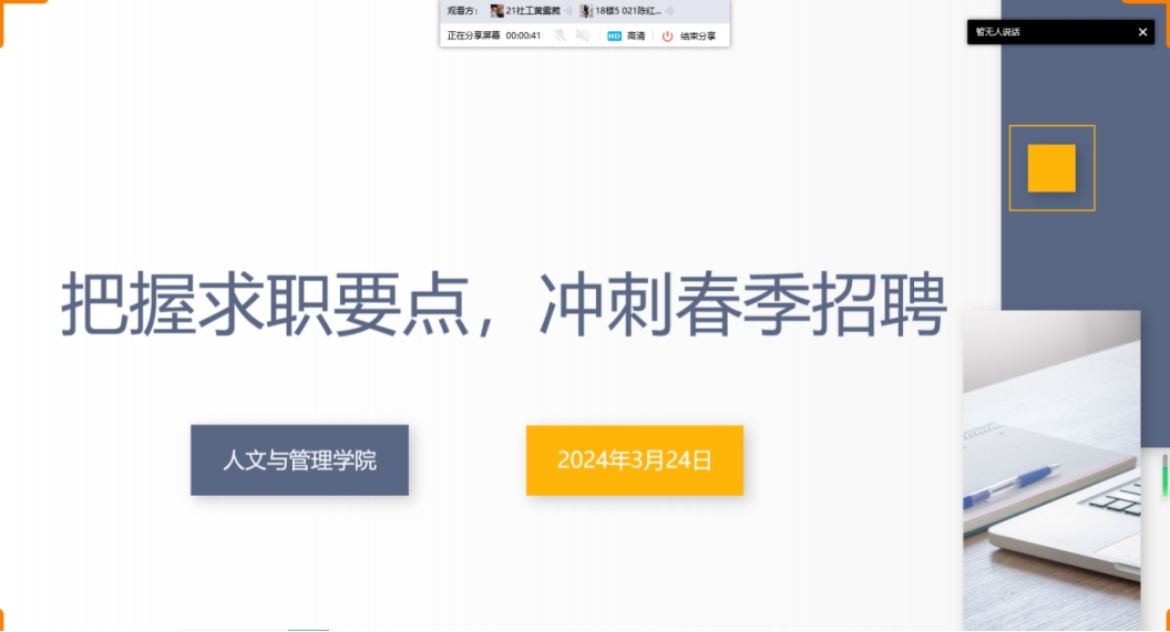 为帮助我院2024届毕业生了解就业形势,把握择业原则,提升就业能力,助力毕业生高质量就业,推动就业工作走深走实,3月24日,人文与管理学院于线上成功开展“把握求职要点,冲刺春季招聘”2024届毕业生就业指导讲座,本次讲座由21级辅导员叶懿蛟老师主讲。