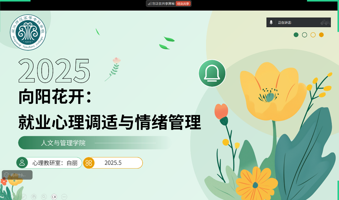 为深入贯彻“三全育人”理念,精准护航毕业生求职之路,5月30日晚,人文与管理学院面向2025届毕业生云端开展 “向阳花开,端正心态——就业心理调适与情绪管理” 专题辅导讲座。本次活动聚焦毕业生求职焦虑疏导与积极心态培育,通过专业心理技术赋能学生职业发展。