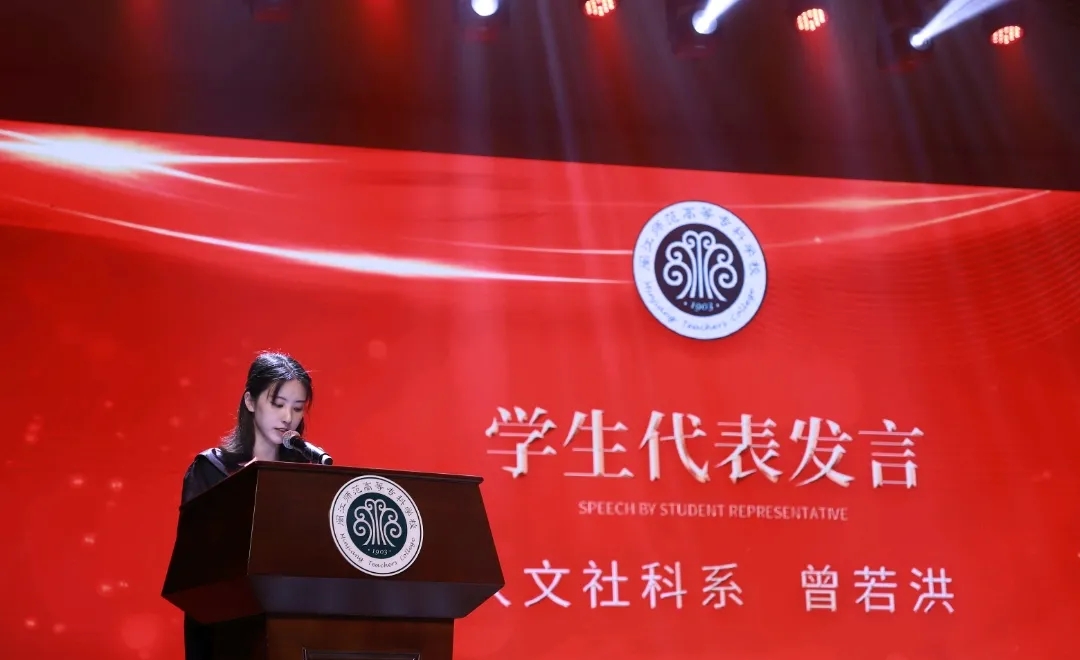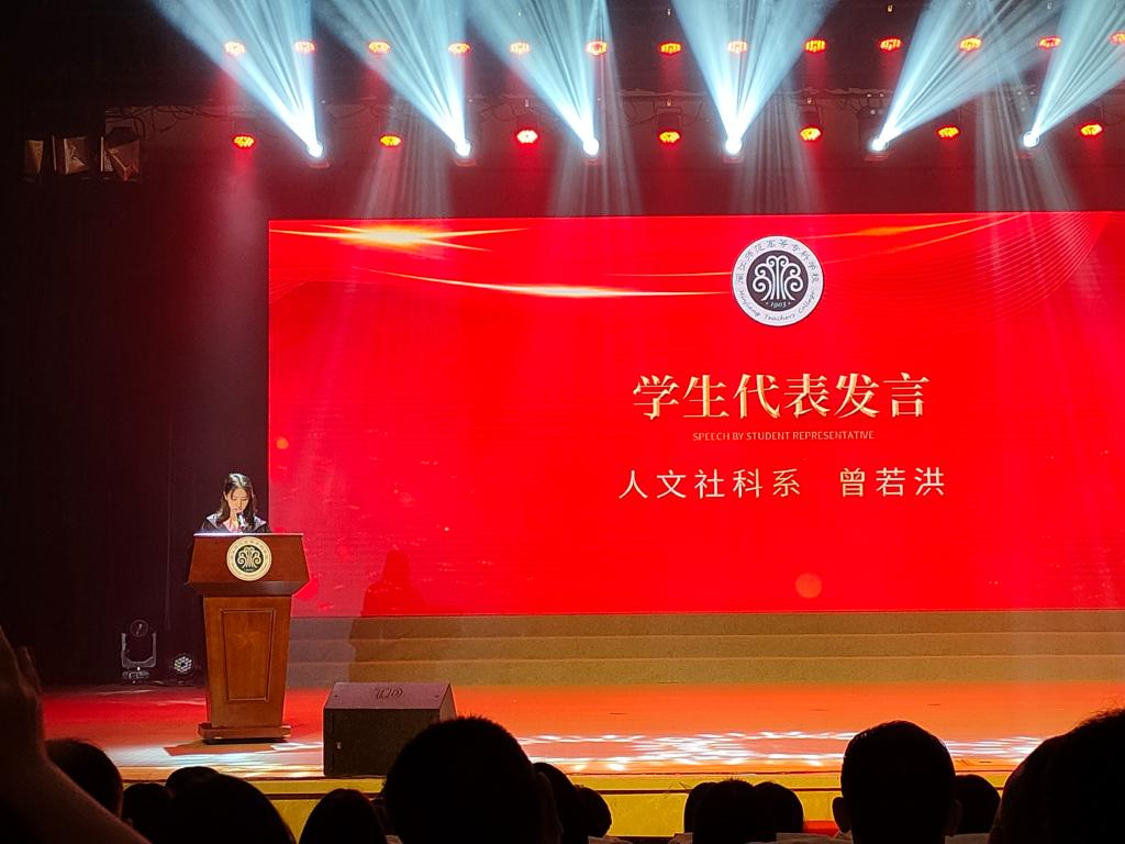 我是来自人文社科系18文秘班的曾若洪。非常荣幸今天能够作为2021届毕业生代表在此发言。三年的校园时光转瞬即逝,第一次的青涩会面还恍若昨日,离别却悄然而至。在这一时刻,脑海里闪现出一幅幅五颜六色的画面,心中感慨万千。此时此刻我们最想做的,还是感恩这一段相遇。现在,请允许我代表全体毕业生,对我们的母校闽江师专、对我们的老师致以衷心的感谢:谢谢你们!