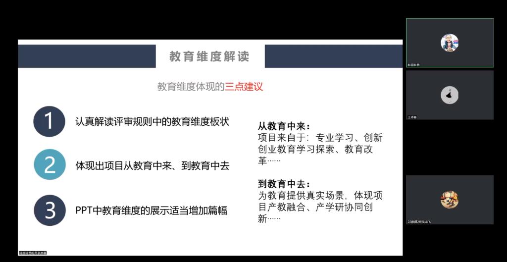 从第八届大赛中教育维度被赋予了30分的最高分值,可以看出,当前大赛的价值导向更加重视育人为本,回归教育初心。张航老师强调,优秀的项目要来自专业学习、来自教育过程、来自学习探索、来自教育改革,同时通过创业反哺教育,形成对教育的正向引领和示范作用,真正做到以赛促教、以赛促学、以赛促创。(文图/ 王宏)