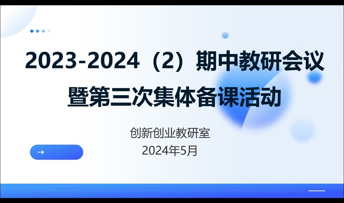 为进一步强化过程监控,深入了解教学运行状况,促进教师教学水平和教学质量不断提高,创新创业教研室于5月15日晚,在线上腾讯会议开展2023-2024(2)期中教研会议暨第三次集体备课活动,会议由教研室主任王宏老师主持,全体专兼任教师参加。
