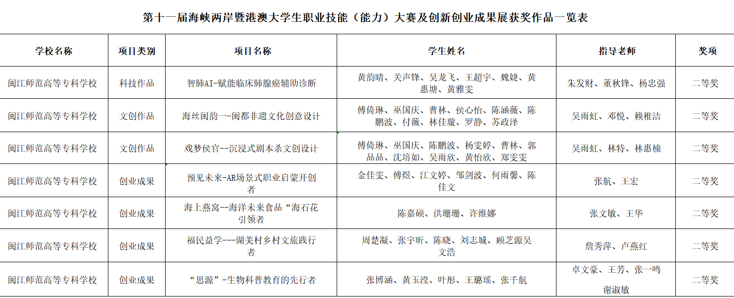 近日,由福建省教育厅、福建省人力资源和社会保障厅、福建省互联网信息办公室、平潭综合实验区管委会联合主办的第十一届海峡两岸暨港澳大学生职业技能(能力)大赛及创新创业成果展在福州英华职业学院落下帷幕。本次大赛共吸引了1019所学校参加,其中高职院校405所,我校选送20个项目作品参加创新创业成果展,经激烈角逐,荣获二等奖7项,三等奖7项,获奖数量创历史新高。