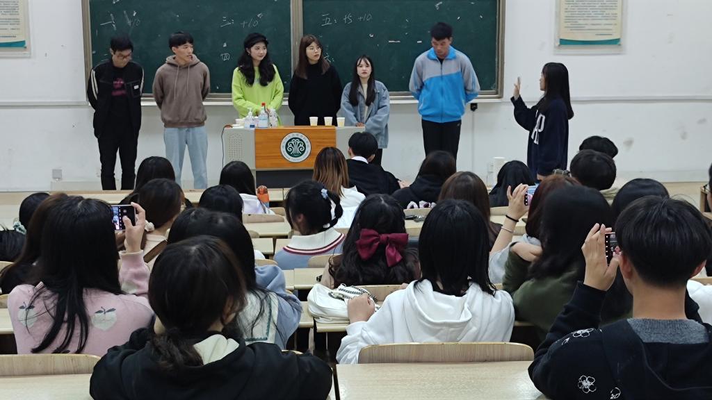 活动分为开场白、热身游戏、主题活动三个部分。活动伊始,主持人介绍了本次活动的目的和内容。首先进行热身游戏“福尔摩斯”让同学们更加熟悉,活跃了活动气氛。随后主题活动开始了,先是“心有灵犀”游戏,同学们组队根据主持人提供词语不出声利用肢体语言传递信息直至最后一名队员猜出,同学们的奇思妙想增添了游戏的乐趣。最后“真假难辨”游戏,同学们组队喝水或者喝盐水让其他队伍的同学猜测谁喝到盐水,现场同学们都展现了“戏精”本能就为了“迷惑”对手,现场一片欢声笑语。
