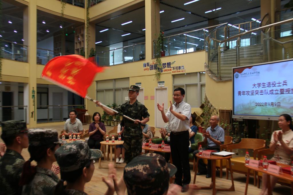 仪式中,谢敏峰副校长为突击队授旗,标志着我校退役大学生士兵青年攻坚突击队正式成立。与会领导、老师还为首批突击队队员一一颁发了聘书,对志愿参与突击队的首批队员们致以敬意。随后,进行了集体宣誓,全体突击队队员身姿挺拔、精神抖擞、整齐列队,面向队旗、右拳高擎,宣誓声慷慨激昂、字字铿锵。在场师生为这群最可爱的人,献上了最热烈的掌声。