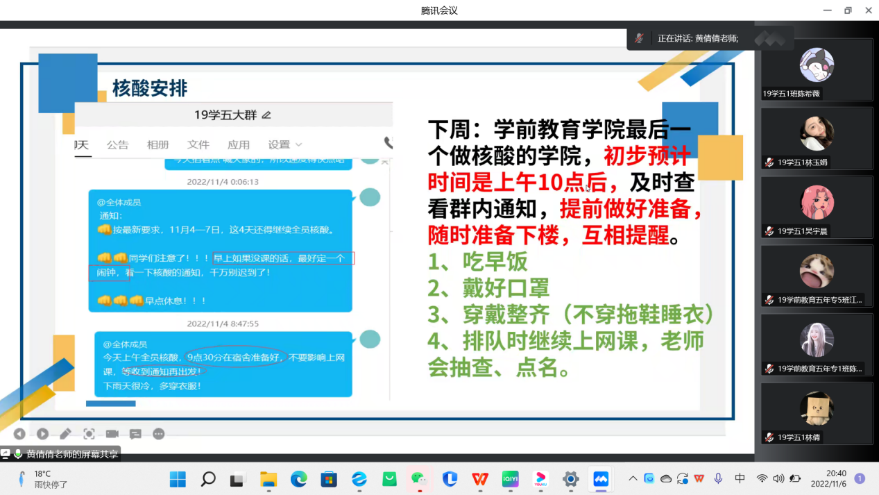 学前教育学院辅导员晚点名主要围绕着学校的疫情防控措施和网课学习两个方面展开。在疫情防控教育方面,辅导员们强调了当前疫情形势的严峻,要求同学们要坚持佩戴口罩、保持社交安全距离、做好个人防护等。此外,针对疫情期间的网课学习,辅导员们强调网课期间仍然要遵守课堂纪律,做到不迟到、不早退、不旷课,要求同学们要加强自我约束,化被动学习为主动学习,保证网课学习质量。