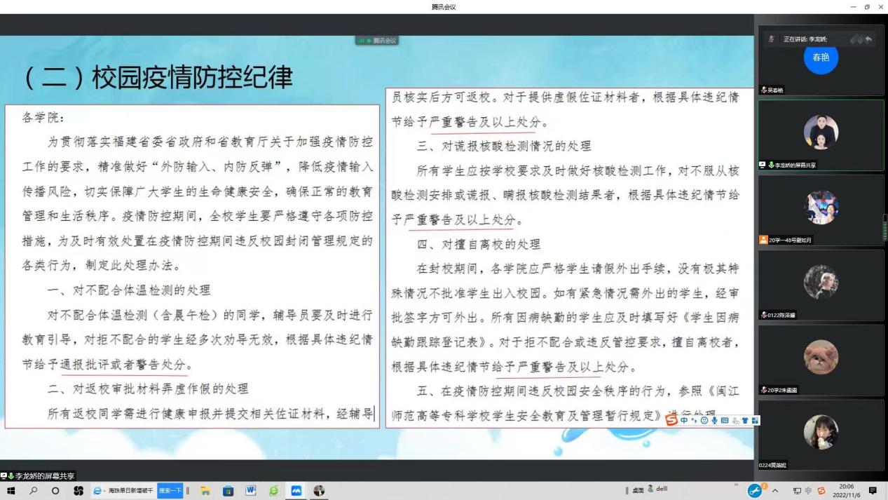 为落实学校疫情防控的各项举措,保障学生教育管理工作的正常开展,2022年11月6日晚,我校全体辅导员与学生们“云中相聚”,在疫情期间,利用多种渠道开展了特别的线上晚点活动,内容丰富,独具学院特色。各学院学工负责人旁听并指导了全体辅导员的线上晚点名。