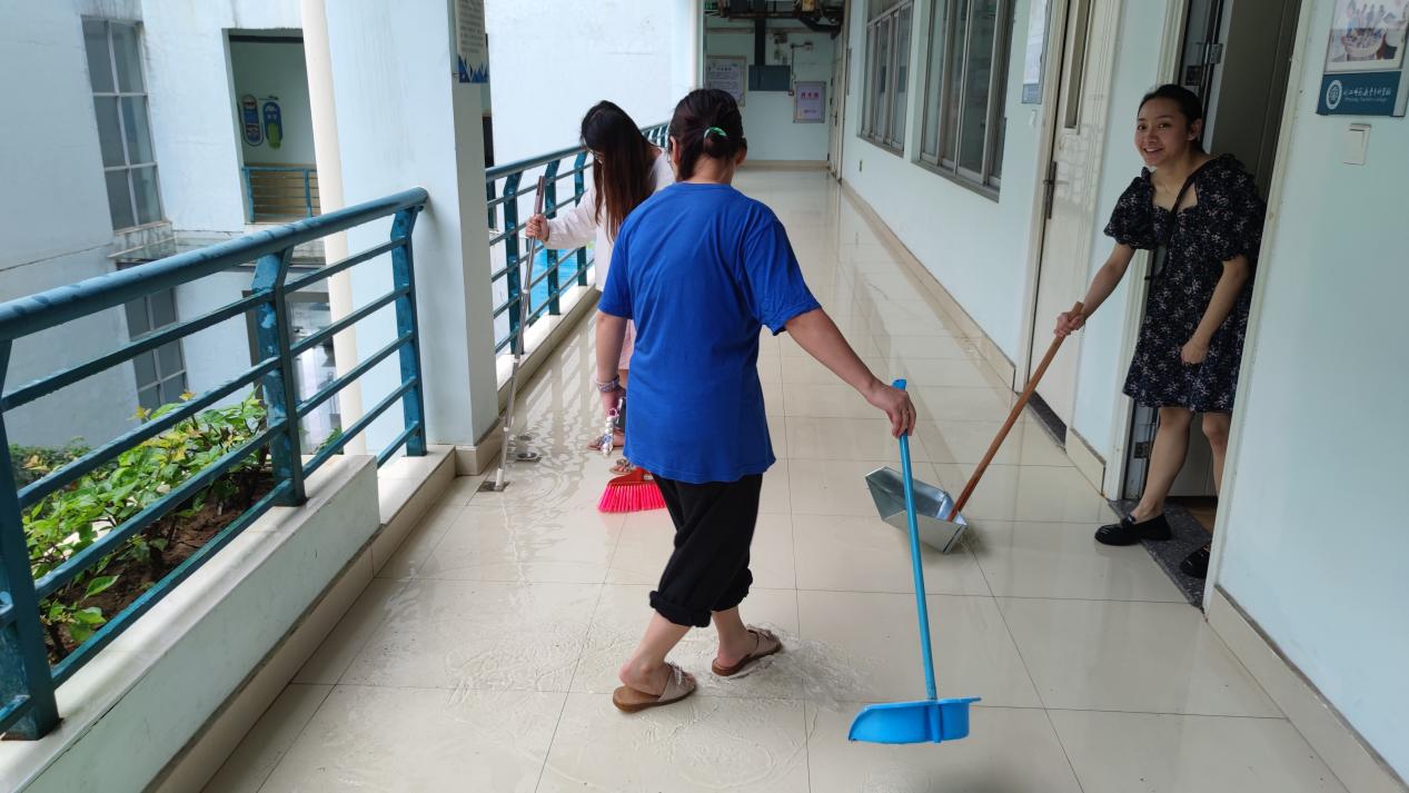 在校内,辅导员和同学们组建了临时志愿者突击队,为受困的学生奔走,妥善安排受困实训室和实验室的学生。暴雨夜,外语商贸学院一名学生因病急需外送就诊,辅导员林珊湉老师不畏惧台风与积水,义无反顾自驾接送学生前往省第三人民医院进行输液治疗,真正做到在风雨中用责任与大爱守护闽师专校园。