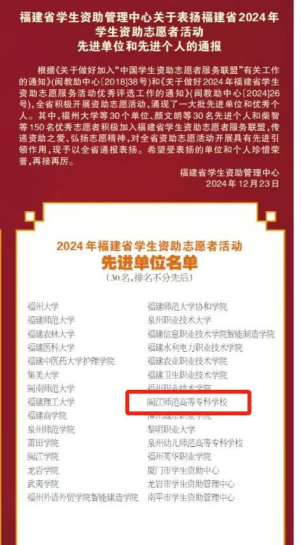 我校喜获2024年福建省学生资助志愿者活动“先进单位”,学生处学生资助中心余彦老师获评福建省学生资助宣传工作“先进个人”荣誉称号。
