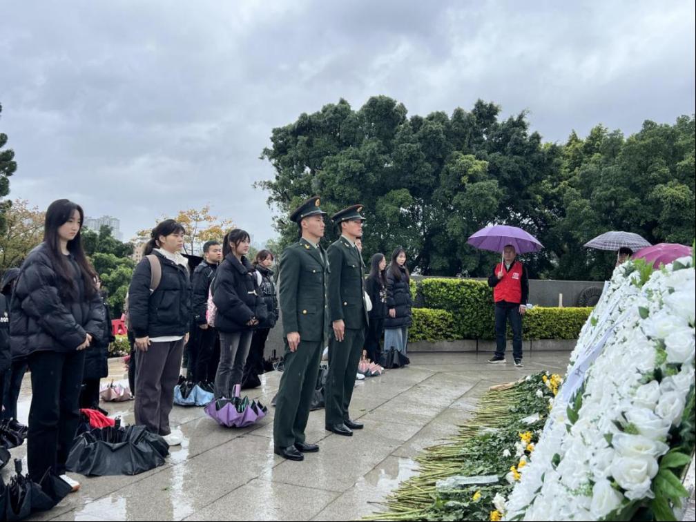 活动当日细雨绵绵,全体人员手捧素白菊花,沿台阶有序行至纪念碑广场。师生代表整齐列队,面向纪念碑庄严宣誓,向纪念碑敬献白花并三鞠躬,表达对革命先烈的深切缅怀。