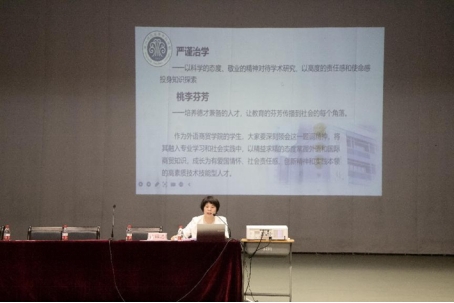 朱发财院长深入解读了校训“养浩然气 广仁爱心”的丰富内涵,阐释了其对品格塑造和社会责任的引导作用;细致剖析了校徽的设计元素,讲解了其中所蕴含的办学理念和精神象征。他结合学校的历史脉络,讲述了学校的重要发展节点和育人成果。朱发财院长特别强调了要牢记习近平总书记对学校寄予的“严谨治学、桃李芬芳”的殷切嘱托,并结合杰出校友的事例,说明了严谨学风的重要性。最后,他介绍了学院未来在学科建设、人才培养等方面的规划,鼓励新生传承校训精神,不懈努力。