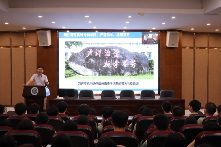 林锦芯书记首先带领大家回溯学校悠久的办学历程,细致解读了校园楼宇命名中蕴含的文化深意,以及校徽、校训、校歌的精神内核,还介绍了众多杰出校友的风采。在此基础上,她殷切勉励同学们,要时刻铭记习近平总书记在福州工作期间对学校提出的“严谨治学、桃李芬芳”的嘱托,让青春梦想扎根时代土壤,以担当精神肩负起时代赋予的重任。林锦芯书记寄语同学们要立志与强国同行,将个人理想融入民族复兴伟业;矢志与时代同频,在时代浪潮中校准奋斗方向;笃志与卓越同向,以精益求精的追求打磨青春底色,努力成长为新时代有理想、有本领、有担当的有为青年。