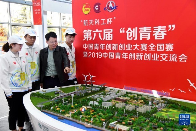 2019年11月1日,在山东青岛举行的第六届“创青春”中国青年创新创业大赛全国赛暨2019中国青年创新创业交流会上,参会人员在给志愿者介绍新乡村智慧能源服务模式。新华社记者 李紫恒 摄