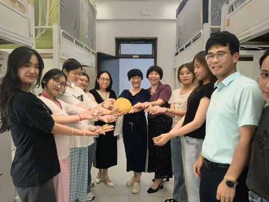 除了热闹的游园会,学院领导更将关怀送到宿舍 “家门口”。他们带着满载心意的中秋礼物,逐间走访学生宿舍,轻轻叩门后,除了热闹的游园会,学院领导更将关怀送到宿舍 “家门口”。他们带着满载心意的中秋礼物,逐间走访学生宿舍,轻轻叩门后,“校园即家” 的温暖。这场集传统风情与人文关怀于一体的中秋活动,以文化活动为纽带,以贴心关怀为桥梁,让师生在互动中凝聚情感,在节日中感受归属。