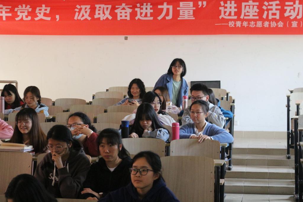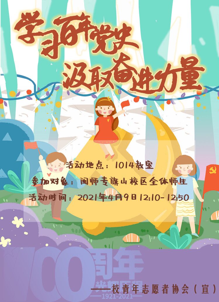 为庆祝中国共产党成立一百周年,激发同学们爱党爱国爱社会主义的精神,坚定永远跟党走的信念和决心。2021年4月9日,由我校团委主办、校青年志愿者协会承办的“学习百年党史,汲取奋进力量”讲座活动在我校旗山校区3015教室举行。