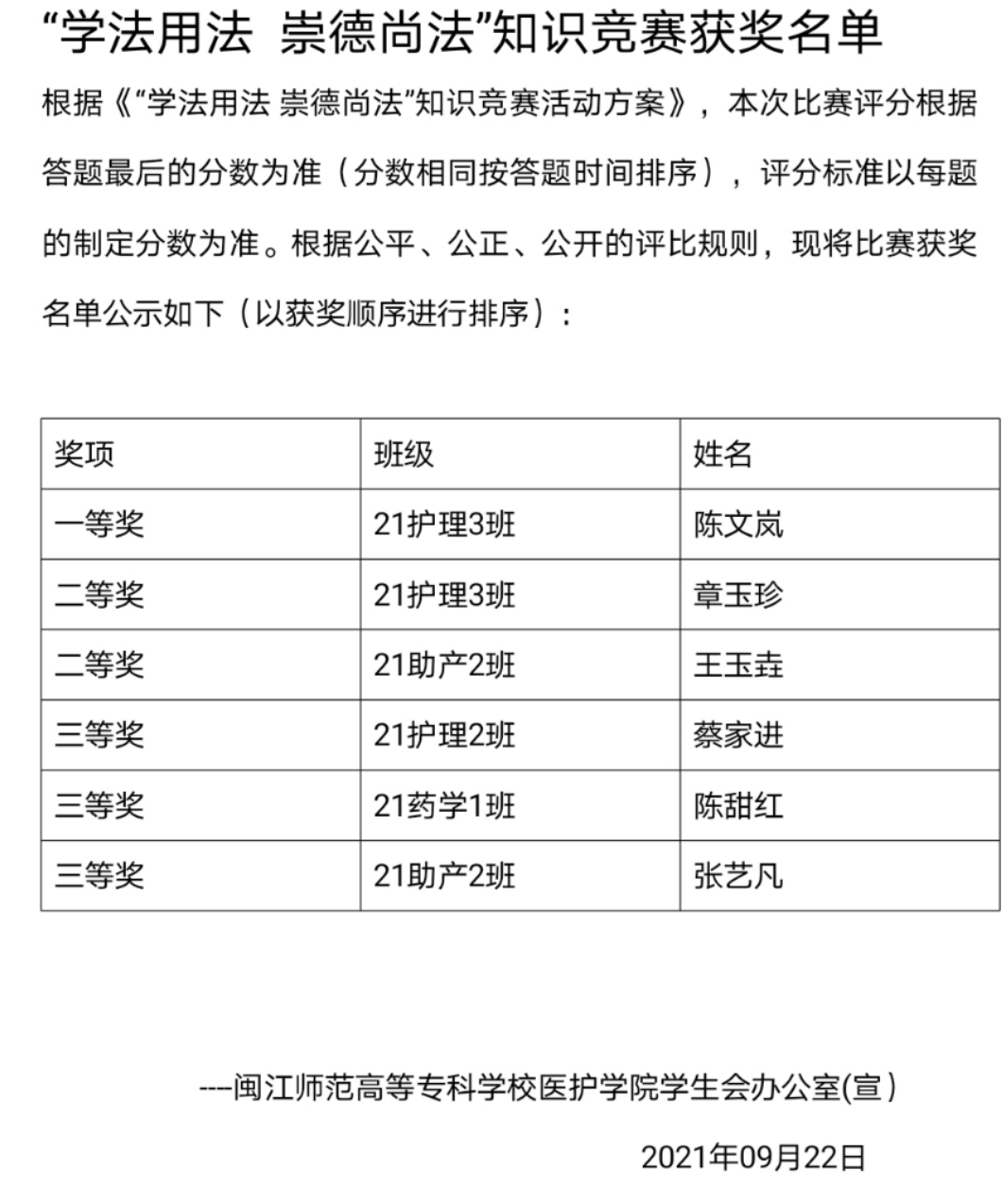 活动前期,学习部的成员积极与老师和相关部门负责人做好沟通并准备好需要的文档、做海报、写方案等以保证活动的顺利进行。活动开始,参赛选手进行一小时的线上宪法知识答题,题型分为单选、多选和判断。活动结束后,经过评审团公平公正的打分,评选出了包括护理3班陈文岚在内的一等奖一名、二等奖两名、三等奖三名。让我们祝贺以上同学,期待他们再接再厉,不断前进!