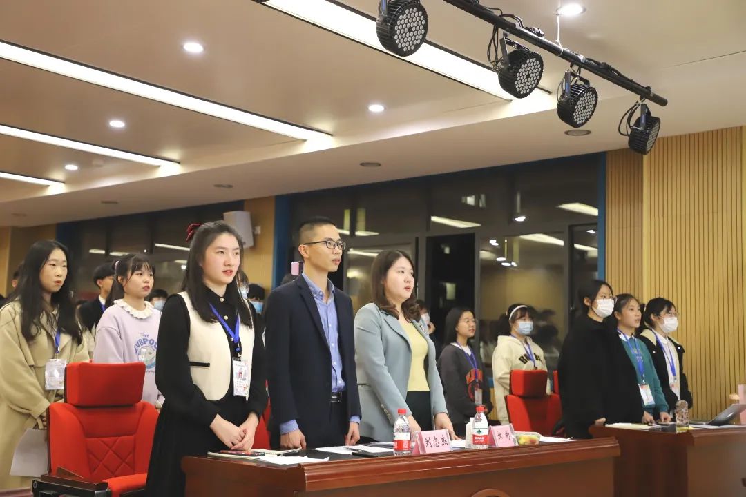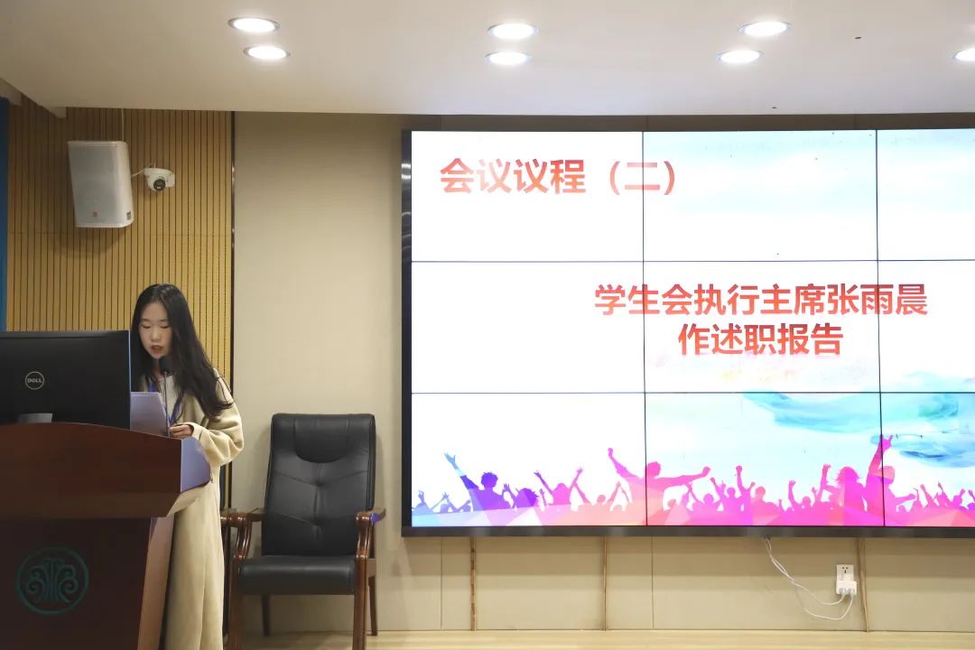 本次会议分别由黄奕、刘亦舒主持,会议在两位主持人致开场词后顺利开幕。本次大会共四个流程。首先,全体起立奏唱团歌;其次,由学生会执行主席张雨晨作以《坚持知行合一,勇担时代使命》为题的述职报告,从工作回顾和工作展望两个角度展开叙述;随后,竞选开始,由校团委老师及在场的各位学生干部共同评选部长团,每轮的每位竞选者轮流上台发言,他们对校团委老师、学长学姐及小伙伴们的帮助和包容表示感谢,也谈了自己在工作中的收获和感想,通过阐述自己的竞争优势为竞选赢得支持,并表示未来矢志愈加严格要求自己,为发挥学生干部代表学生、服务学生的功能殚精竭虑。如同青年志愿者协会红十字会曾熙提到:“彼方尚有荣光在”,对于竞选者来说,本次竞选既是对自己一直以来的工作的自信和阶段性总结,也是对自己的未来工作予以更高标准的要求。
