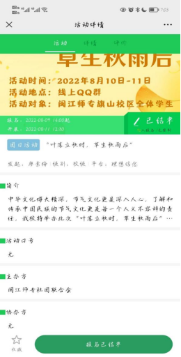 为弘扬节气文化,传承中华文明,进一步增强当代青年大学生的文化传承意识和文化传承使命感。2022年8月10日至11日,由闽江师范高等专科学校社团管理中心主办,校冰心志愿者服务大队承办的“叶落立秋时,草生秋雨后”观影活动面向全校师生在线上举办。
