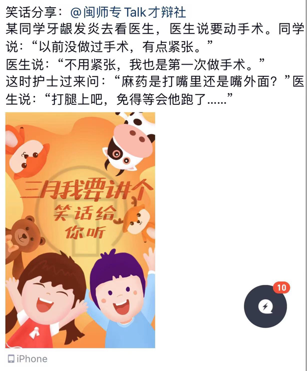 为了锻炼学生的语言表达能力,拓宽社团成员的交流渠道,拉近社团成员间的距离,闽江师范高等专科学校社团管理中心Talk才辩社于2022年3月28日举办了主题为“三月我要讲个笑话给你听”的线上活动。仓山、福清校区全体社团成员通过发表各种各样的笑话,让我们在疫情防控之时,也能感受到笑声带来的温暖。