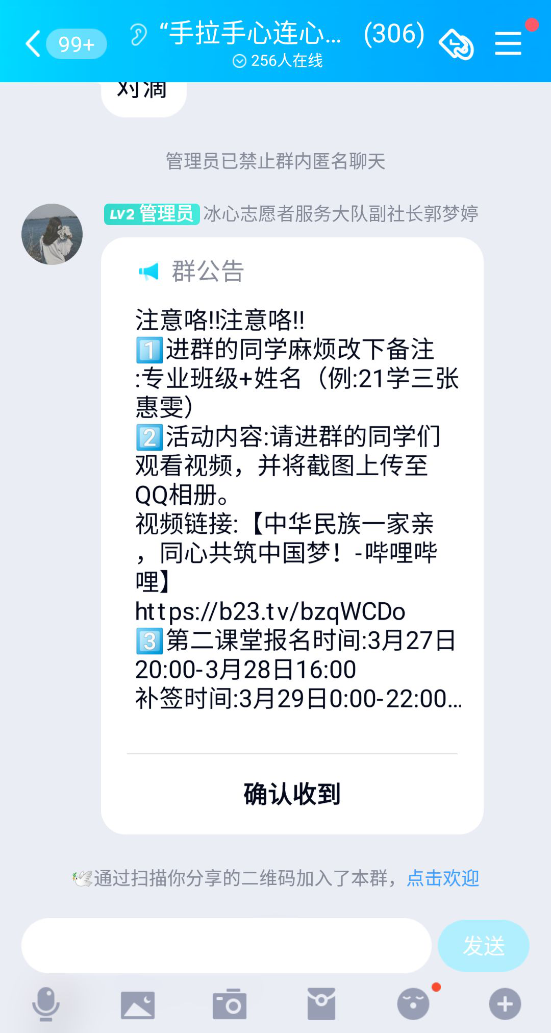 活动当天,以QQ群为载体,工作人员播放了“中华民族一家亲,同心共筑中国梦”主题视频,视频从民族艺术、民族饮食、民族通婚、民族权益等方面出发,展示了民族团结进步事业的伟大成就,体现了全体中国人民和中华民族的价值追求,将56个民族的团结力量凝结其中。视频放映期间,同学们认真观看,学习民族文化、感悟民族情结、体会其中蕴含的“幸福共筑,亲如一家”情感。