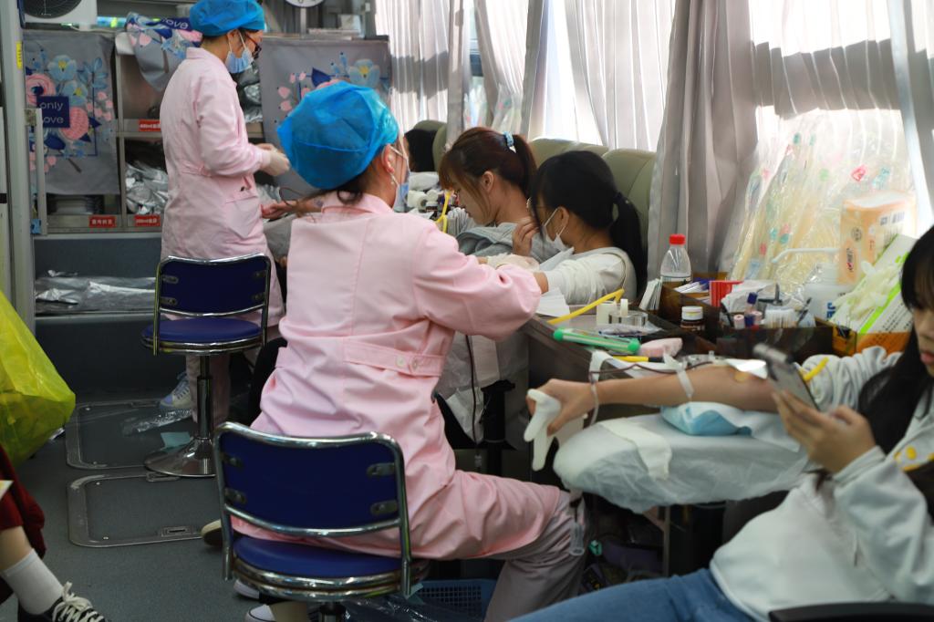 活动当天,虽烈日当空,但前来献血的师生仍络绎不绝。在志愿者的组织下,师生们按顺序进行了领表登记、血型测定、体检、抽血和观察休息,在工作人员的讲解和鼓励下,奉献爱心的同学们每人献出不同规格的鲜血,处理创口之后,由志愿者带到休息区,赠送一份糖水、牛奶、面包、鸡蛋和点心等食物,同时关心询问并观察了献血者身体恢复情况。