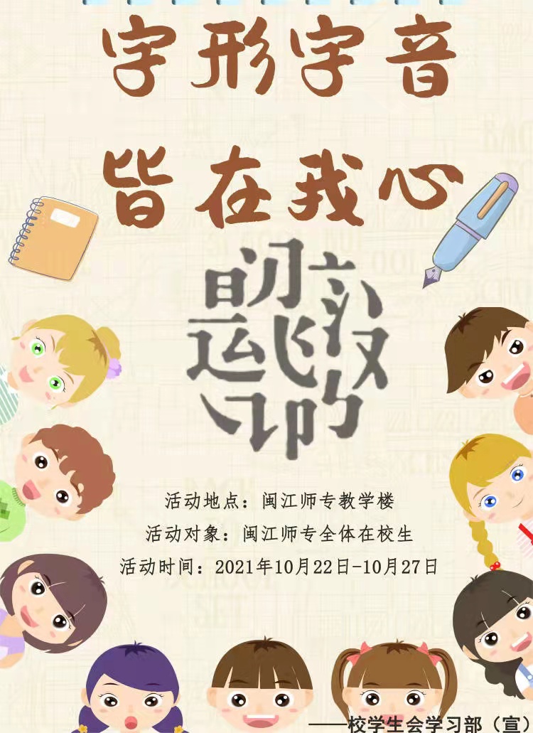 为进一步丰富校园文化生活,营造书香校园文化氛围,夯实同学们的字词基础。闽江师范高等专科学校学生会学习部在2021年10月22日至10月27日期间面向全体学生开展了以“字形字音,皆在我心”为主题的校园字词比赛。