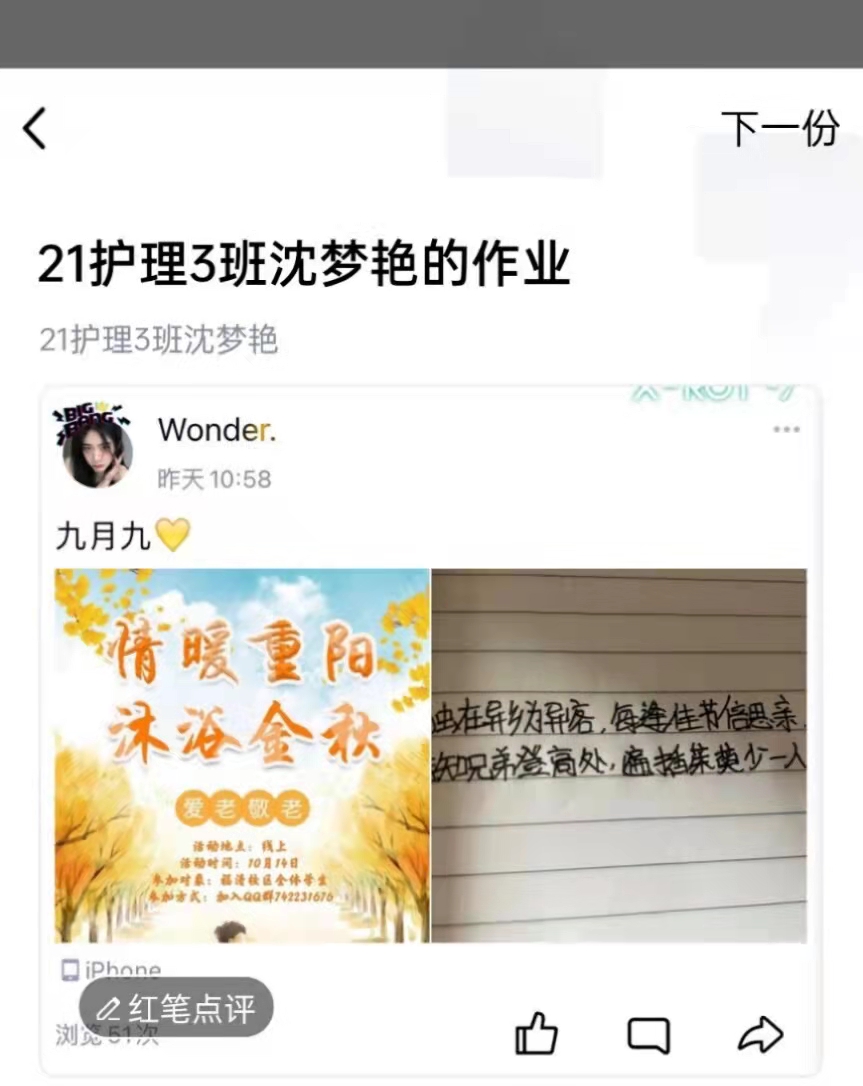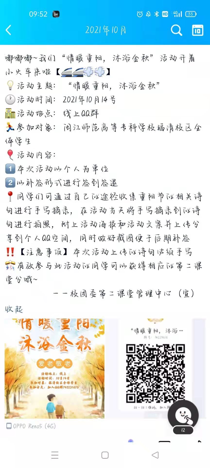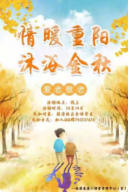 为弘扬中华民族传统节日,培养知恩图报的朴素品德。2021年10月14日,由闽江师范高等专科学校校团委主办,校团委第二课堂活动中心协办的“情暖重阳,沐浴金秋”重阳节主题活动在线上面向闽江师范高等专科学校福清校区全体学生开展。