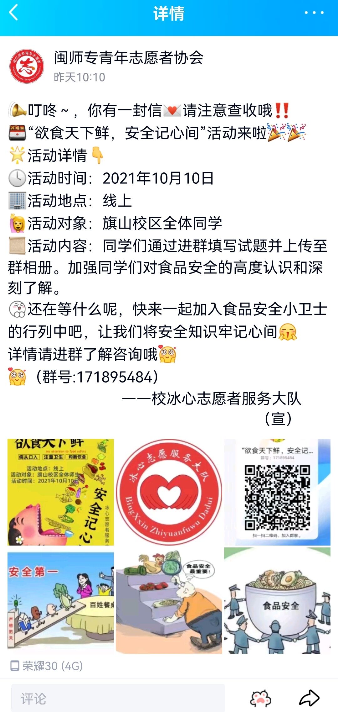为增强我校学子食品安全的意识,让更多同学了解食品安全的重要性。2021年10月10日,由闽江师范高等专科学校团委主办、冰心志愿者服务大队承办的“欲食天下鲜,安全记心间”活动在线上向旗山校区全体师生举办。