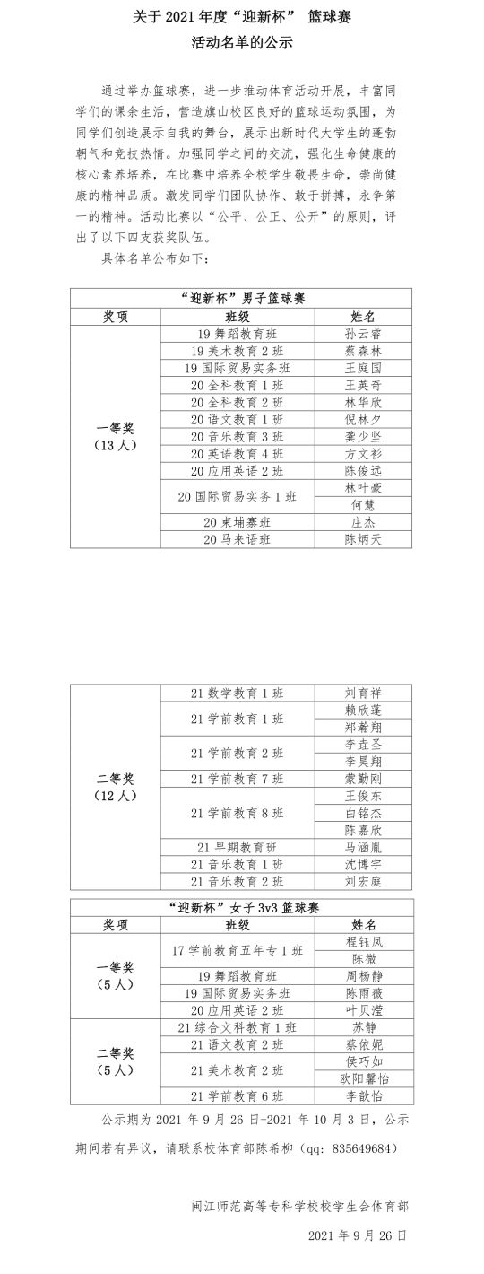 为了进一步推动体育活动开展,丰富同学们的课余生活,营造旗山校区良好的篮球运动氛围,展示我校学子的蓬勃朝气和竞技热情。2021年9月,我校团委学生会体育部在闽江师范高等专科学校旗山校区篮球场,面向超人篮球社以及21级旗山校区全体新生开展主题为“迎新杯”篮球赛活动。