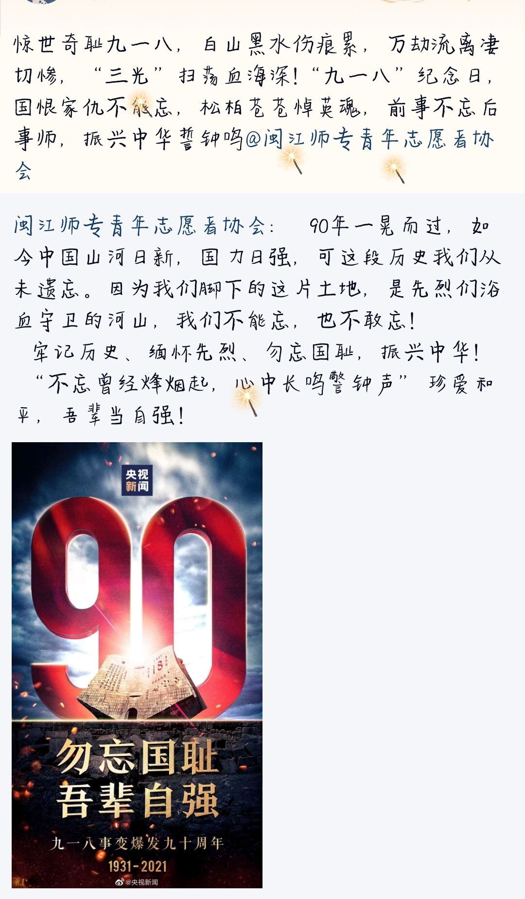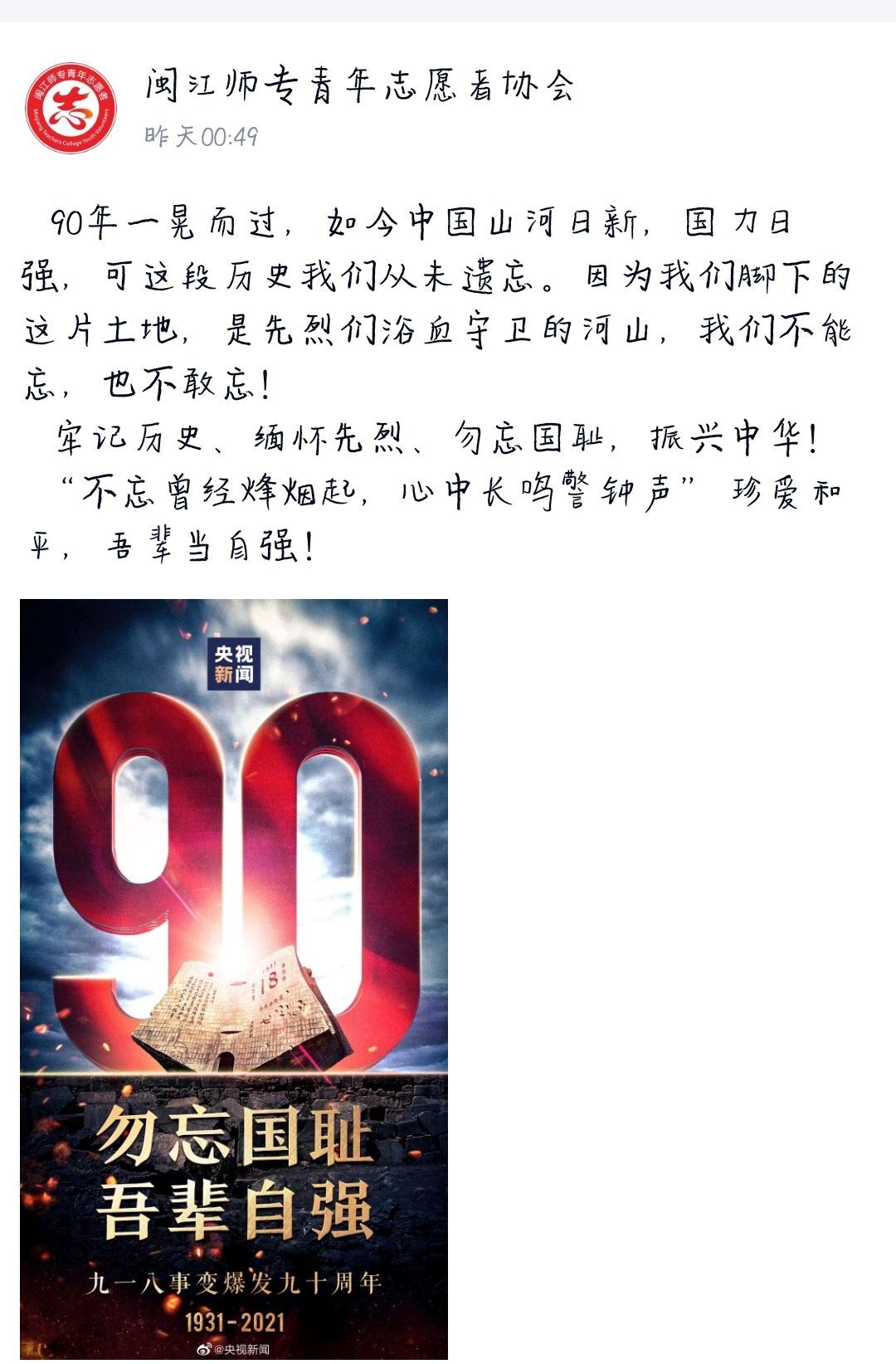 为进一步培养我校学子的爱国主义情感,加强历史责任教育,深入学习中国革命史,鼓励广大学生努力学习、励志成才、报效祖国。2021年9月18日,我校青年志愿者协会在线上,面向闽江师范高等专科学校旗山校区全体师生开展为“勿忘国耻,振兴中华”主题活动。